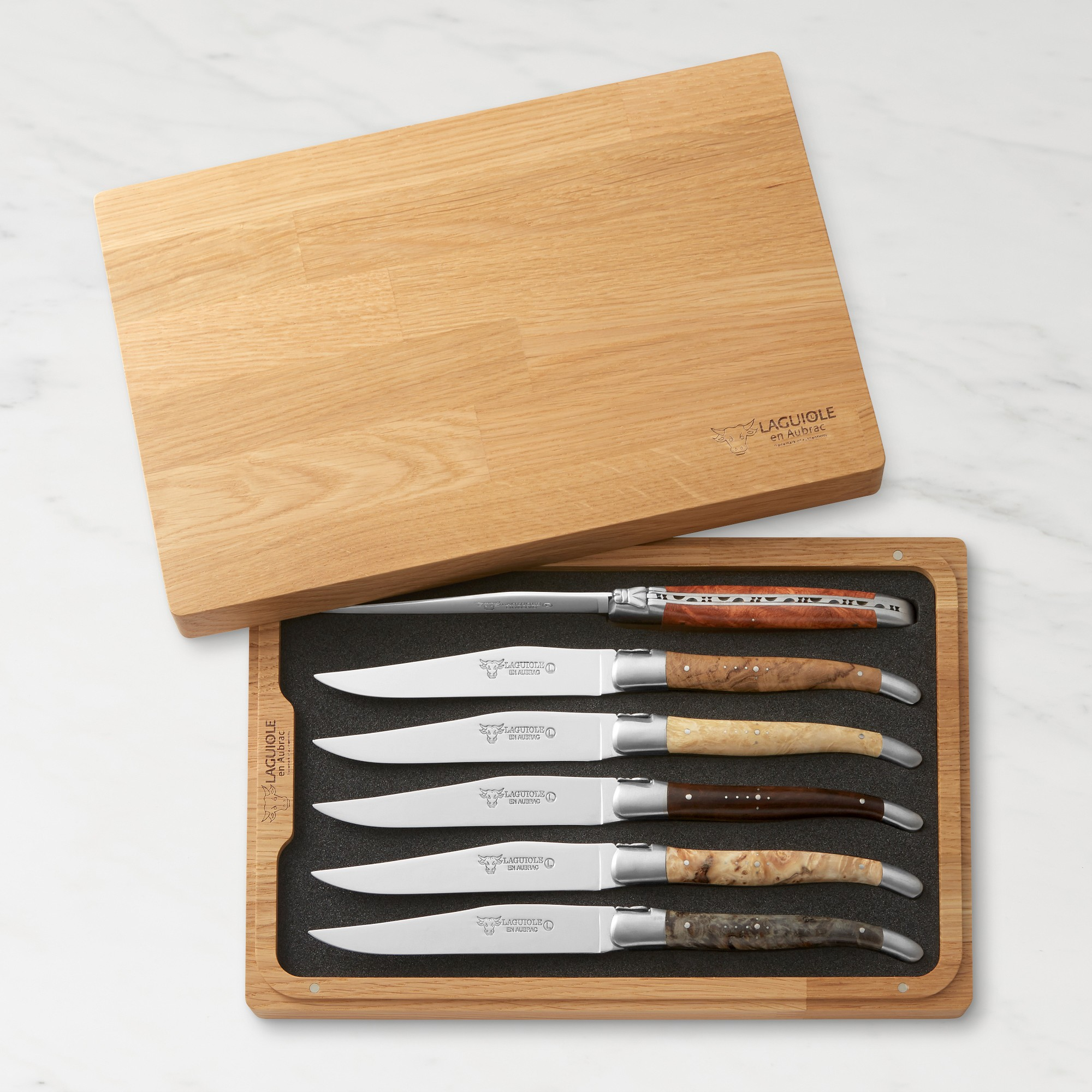 Look no further than the Village of Laguiole (pronounced either lah-yole or lag-yole depending on the region of France you are in) for some of the best knives in the world. This set includes knives with handles made from olivewood, juniperwood, pistachio tree, briar tree, amourette wood and ebony.